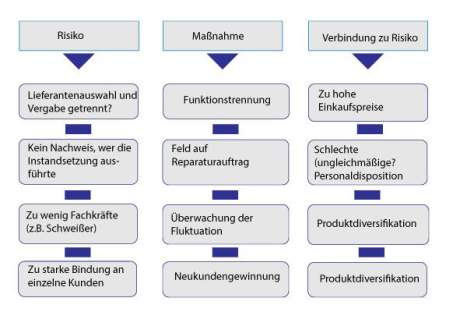 Diagramm zur Darstellung von Risiken, Korrekturmaßnahmen und Verbindungen zur Sicherstellung von Zuverlässigkeit und Minimierung betrieblicher Schwachstellen.