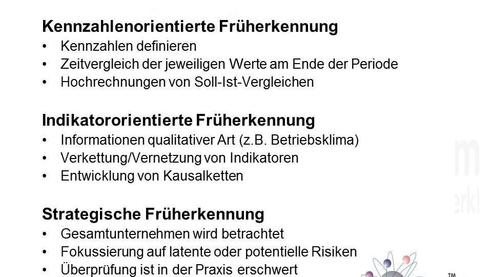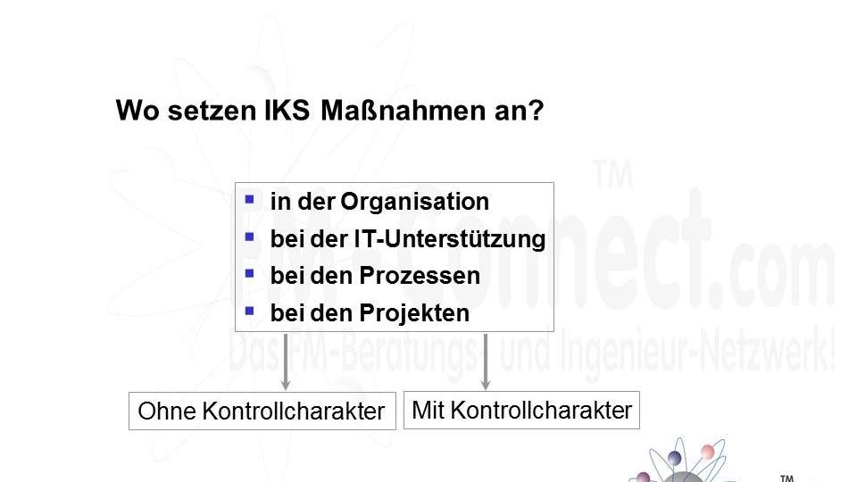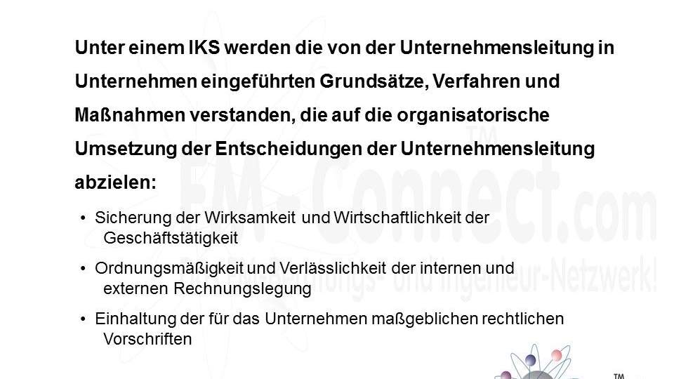 Das IKS beinhaltet alle organisatorischen Maßnahmen, die Risiken identifizieren, bewerten und minimieren. Dabei handelt es sich nicht nur um finanzielle Risiken, sondern auch um Risiken im Bereich der Arbeitssicherheit, des Umweltschutzes und der Compliance. Das Ziel des IKS ist, die Wirksamkeit und Effizienz der Geschäftsprozesse zu steigern und die Einhaltung von gesetzlichen und internen Vorschriften sicherzustellen.