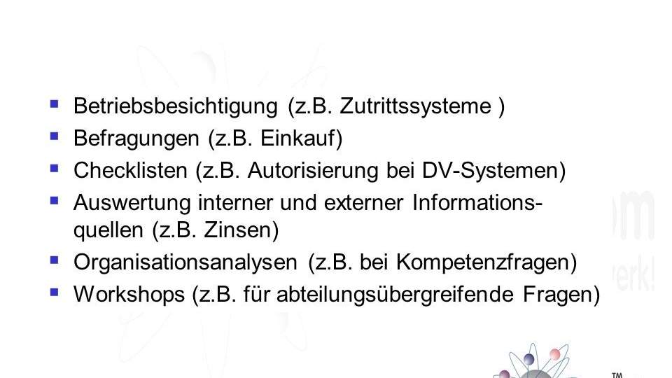 Risikoanalyse: Die Risikoanalyse dient dazu, potenzielle Risiken zu identifizieren und zu bewerten. Hierbei werden alle relevanten Faktoren berücksichtigt, wie z.B. die Wahrscheinlichkeit und Auswirkung des Risikos, sowie die vorhandenen Kontrollmaßnahmen.